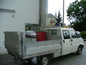 Vorher haben wir den Pritschenwagen als „Servicemobil“ umfunktioniert, d.h. Werkzeugwagen, Wasserkanister für die 20l Kühlwasserfüllung, Motor- und Getriebeöl, etc… verladen und gleich zur Garage geliefert.