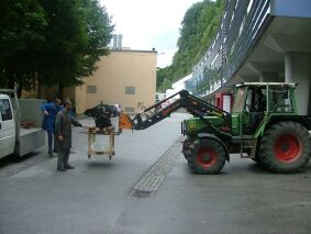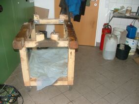 Da wir mittlerweile wieder ein Transportfahrzeug haben, können wir den Motor mit Gestell zur Garage bringen: