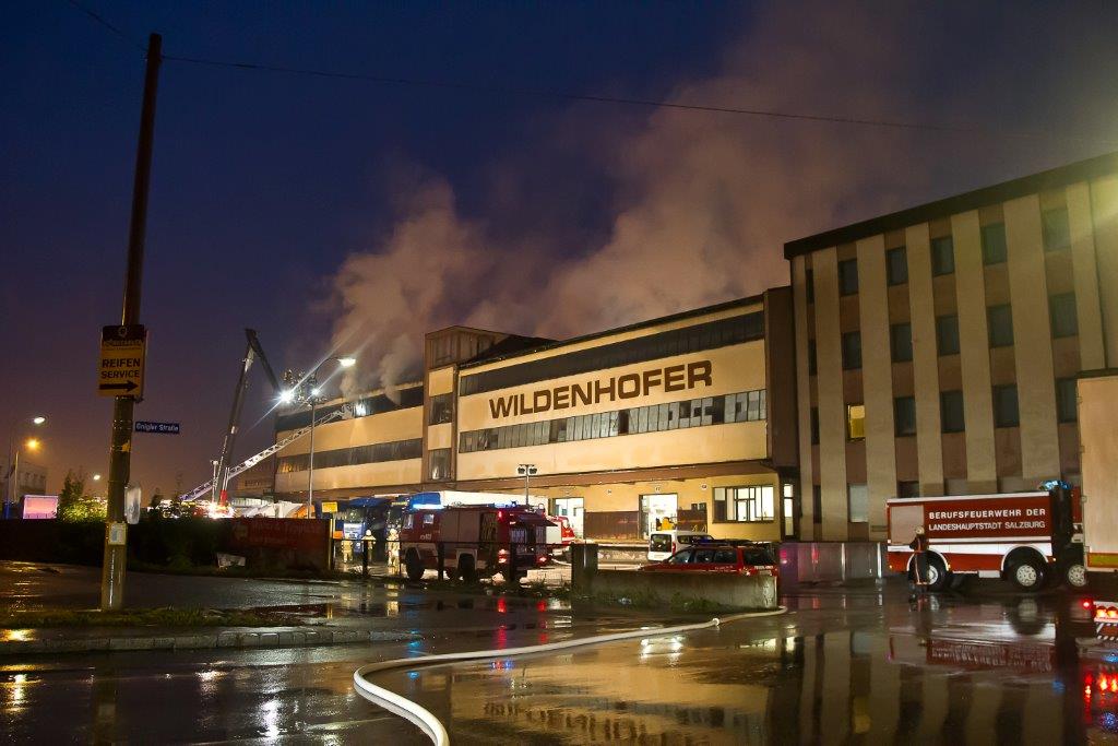 Auf den ersten Alarm rückten Tank 1 und Pumpe 1 Bruderhof zur Einsatzstelle aus. Schon auf der Anfahrt konnte starker Rauchgeruch festgestellt werden. Bei der Ankunft konnte man sehen wie aus dem 2 OG und Dachgeschoß dicke Rauchschwaden sich über das Gelände der Spedition Wildenhofer verteilten. Auf der östlichen Seite arbeitete bereits die Mannschaft der Berufsfeuerwehr. Der LZ Bruderhof wurde zur umfassenden Brandbekämpfung auf der westlichen Seite des Gebäudes eingesetzt. Während hier die Aufbauarbeiten begannen rückten noch Tank 2 und Pumpe 2 Bruderhof an die Einsatzstelle nach.