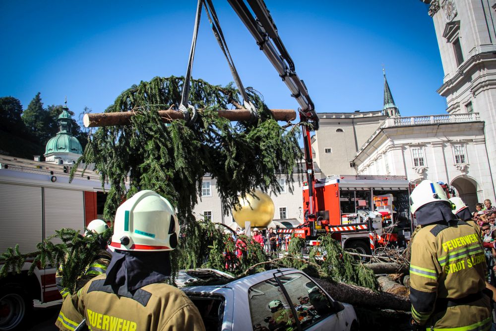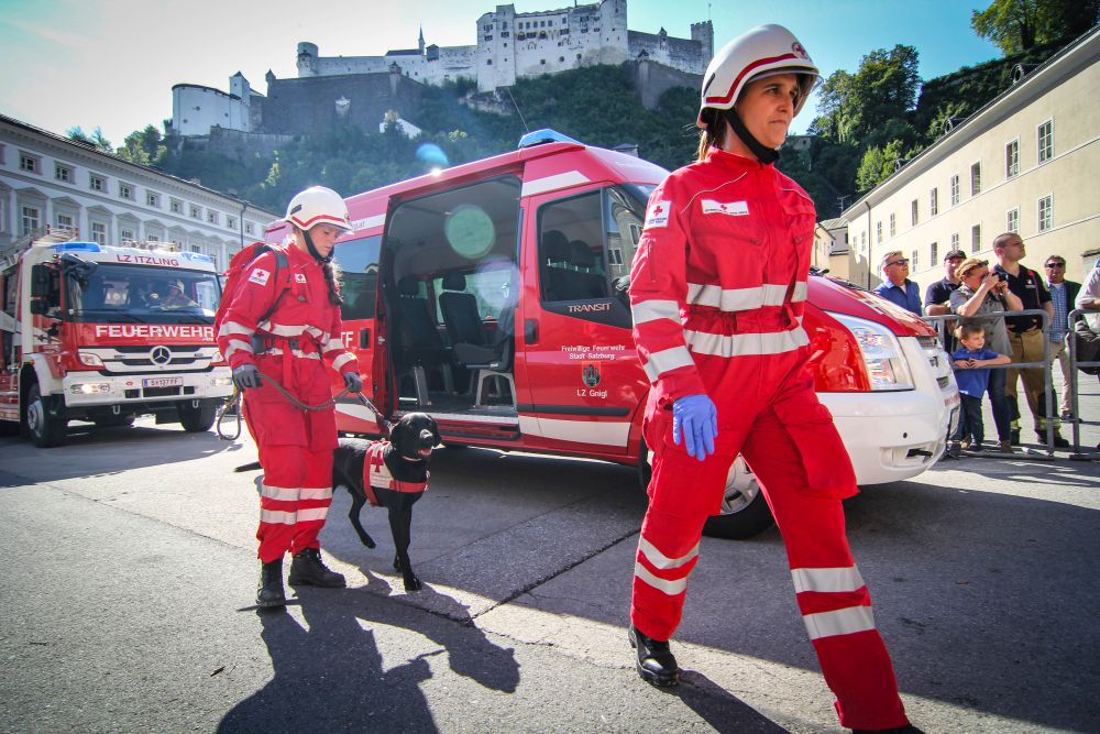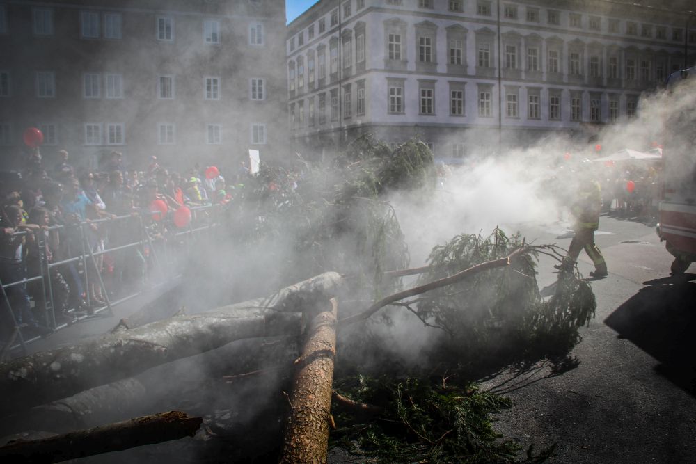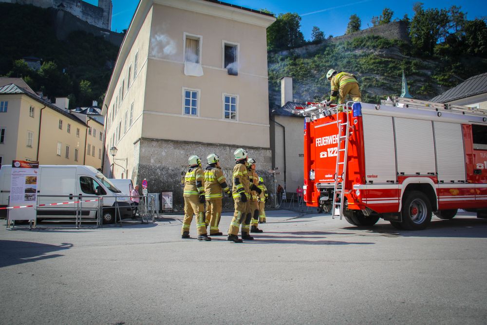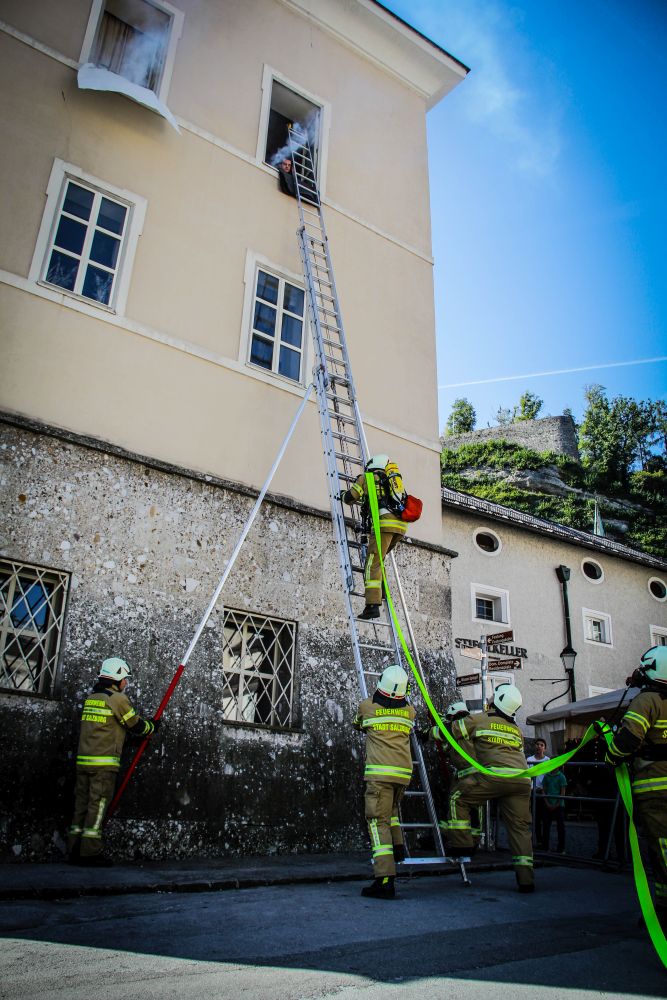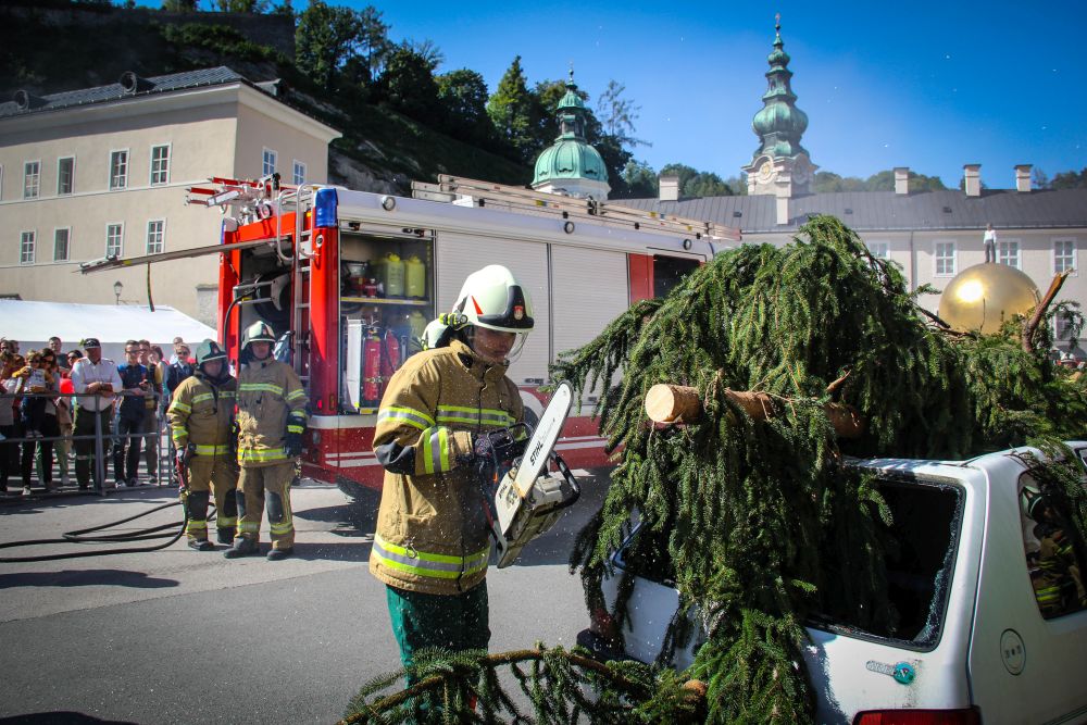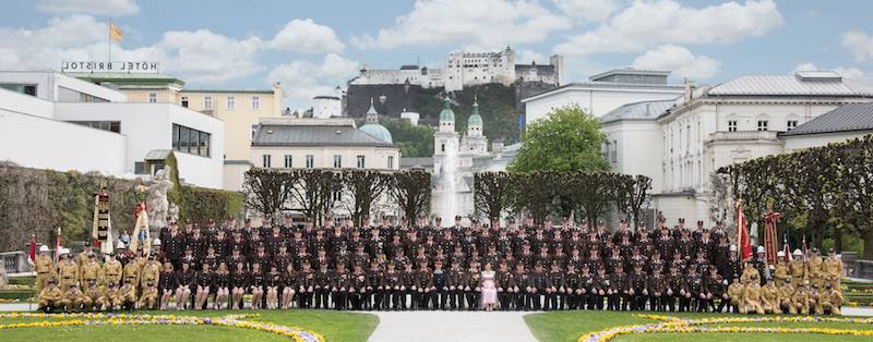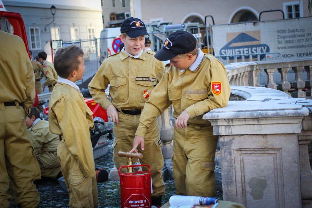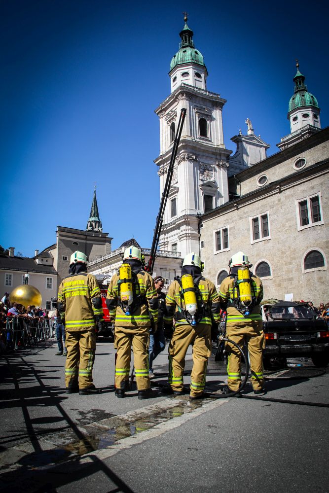 Gegen Mittag waren die Vorführungen zu Ende und es sammelten sich über 1.000 Feuerwehrkameraden aus nah und fern bei der Evangelischen Kirche am Elisabethkai, zum Festmarsch in die Altstadt. Mit einem würdigen Festakt in beindruckender Kulisse am Residenzplatz gedachte man des Jubiläums der Freiwilligen Feuerwehr Salzburg Stadt. Auch die Gemütlichkeit und das Feiern dürfen hier nicht fehlen. Nach Beendigung des Festaktes, begaben sich die Formationen auf das vorbereitete Festgelände bei der Stieglbrauerei.