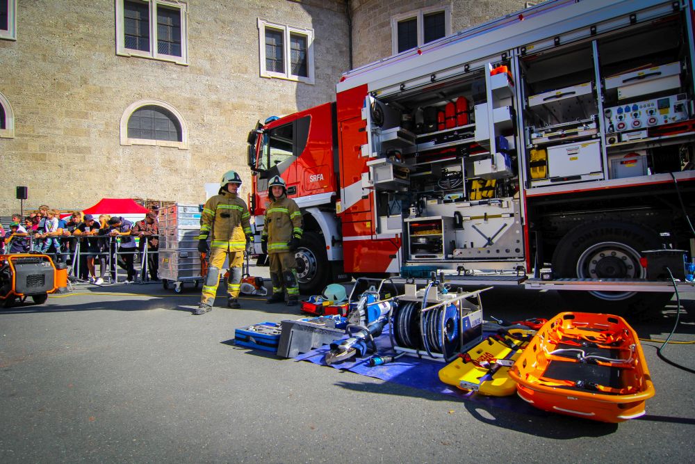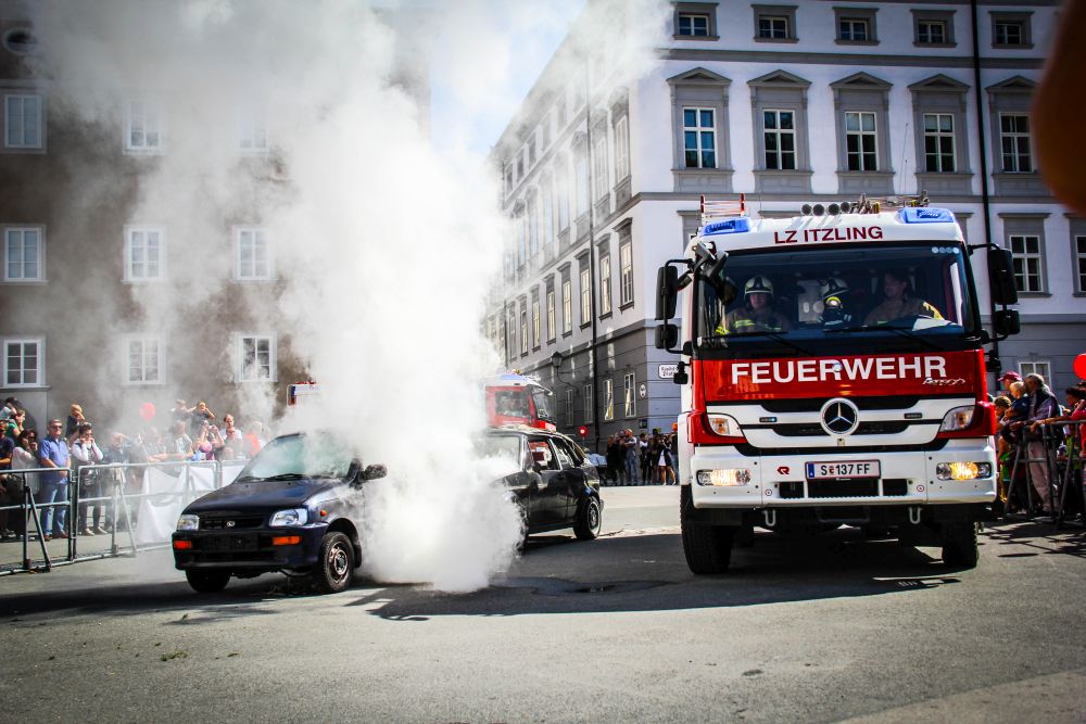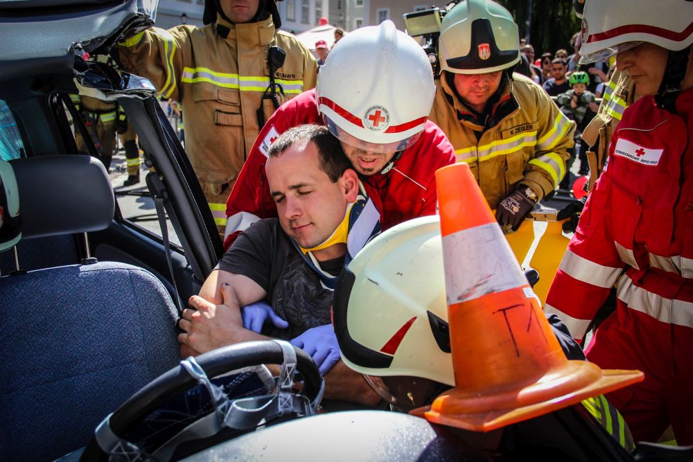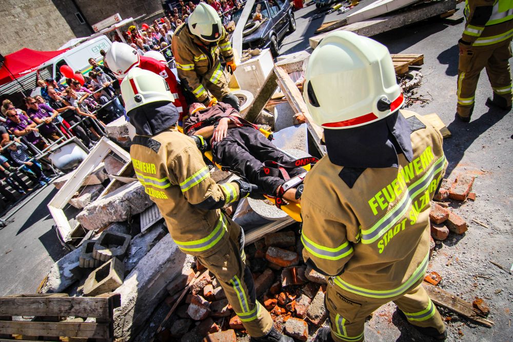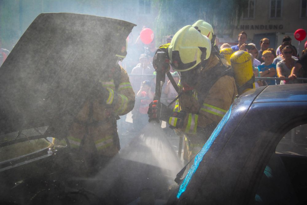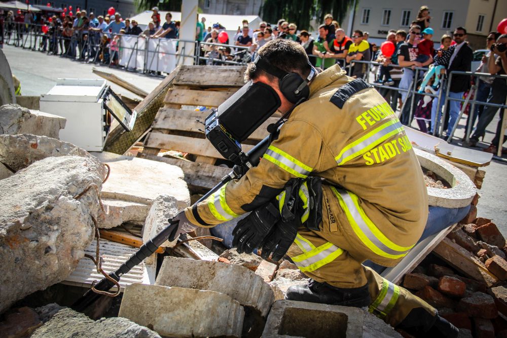 Am Kapitelplatz wurde eine Leistungsschau mit verschiedensten Übungsszenarien präsentiert. Vom Zimmerbrand im zweiten Stock, über einen Verkehrsunfall, einem Sturmeinsatz und nicht zuletzt die Vorstellung der HUSAR Gruppe mit der Suche nach verschütteten Personen in einem Trümmerfeld, wurden gezeigt.
