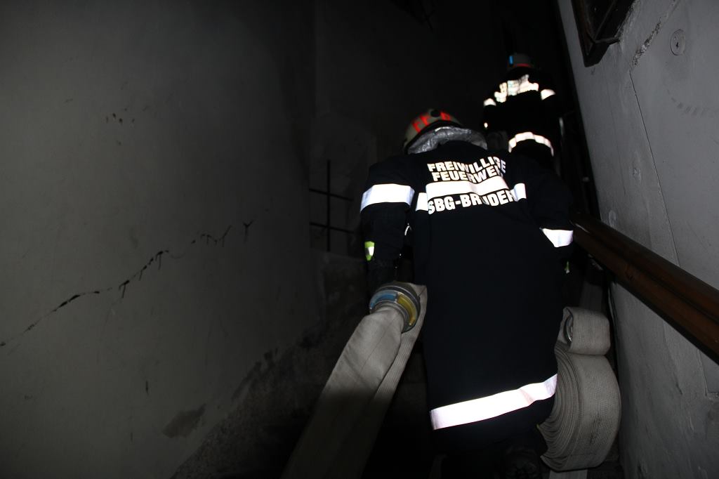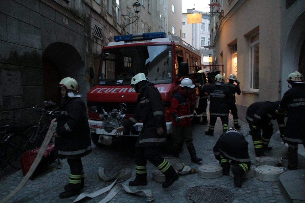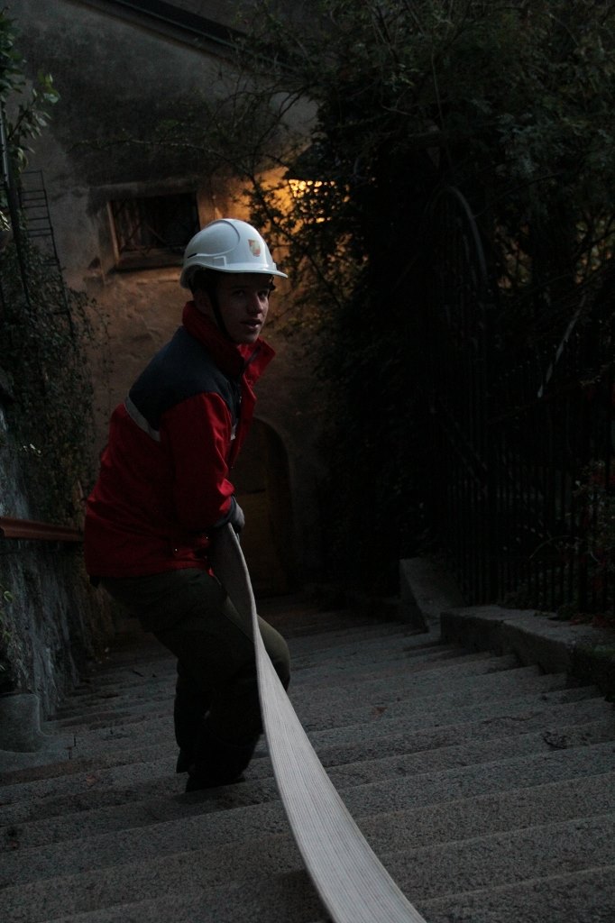 Schwerpunkt dieser Übung, war die Wasserförderung über lange Wegstrecken, vom Hydranten in der Steingasse mit einer B-Leitung über die Imbergstiege zu einer Relaisstelle beim Kapuzinerkloster und dann weiter zur „Brandstelle“.