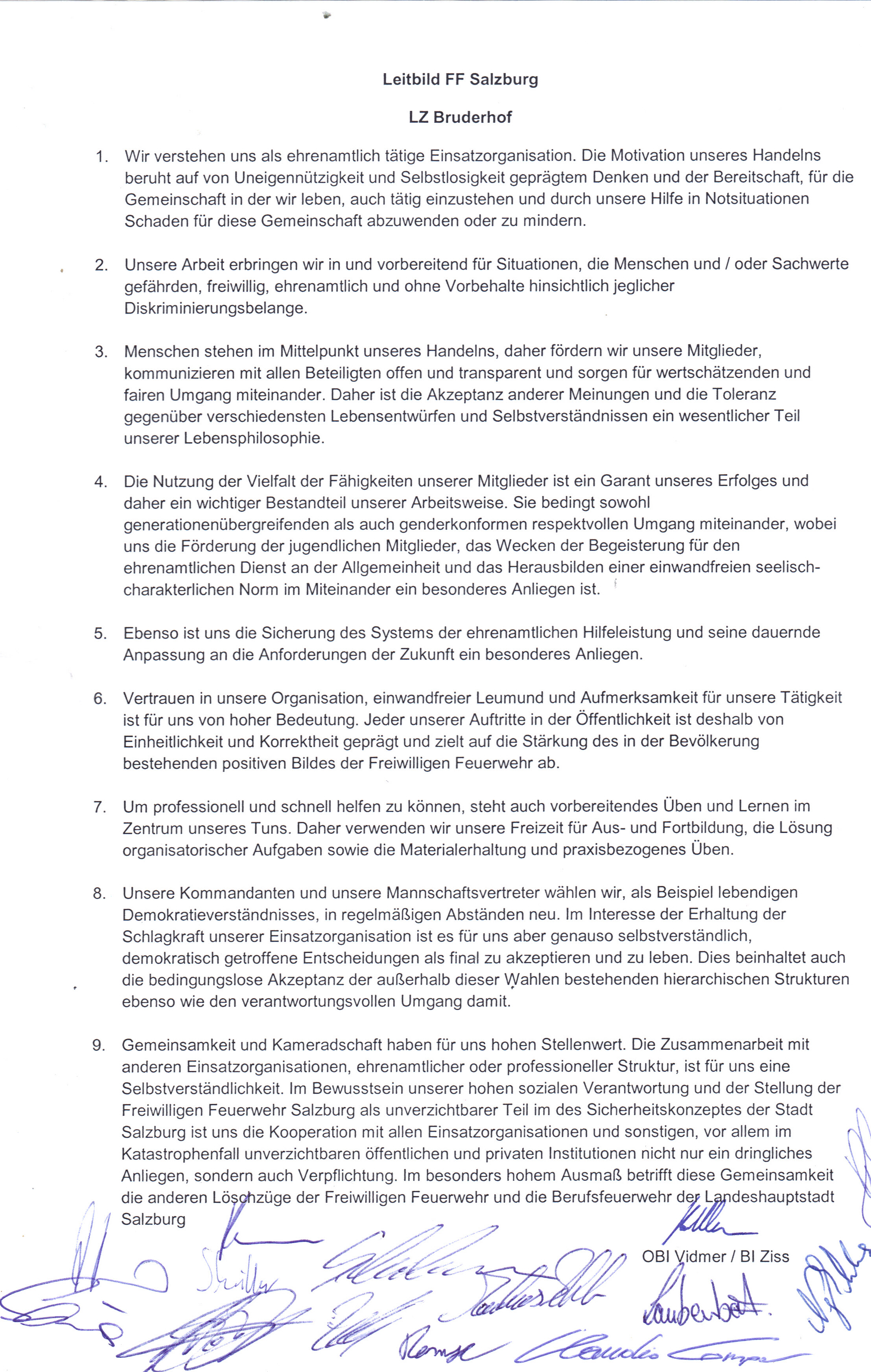 Leitbild des LZ Bruderhof Beweggründe unseres Tun und Grenzen unseres Handelns ! Mit den Unterschriften bekräftigt das Kommando des LZ Bruderhof, geschlossen die Wertigkeiten unseres Handeln und unseres Wirkens.